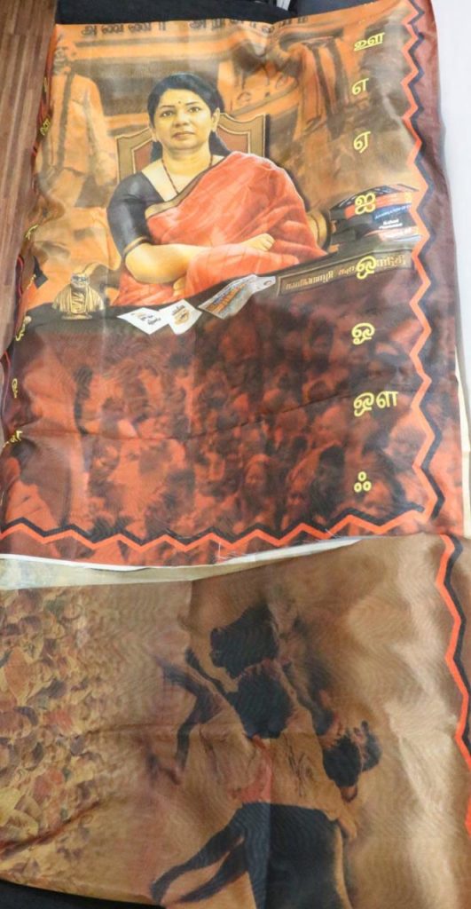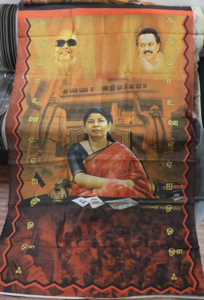 முந்தானையில் முழு உருவப்படம் கனிமொழி படத்துடன் கலக்கும் புடவை பிறந்தநாள் கிப்ட்